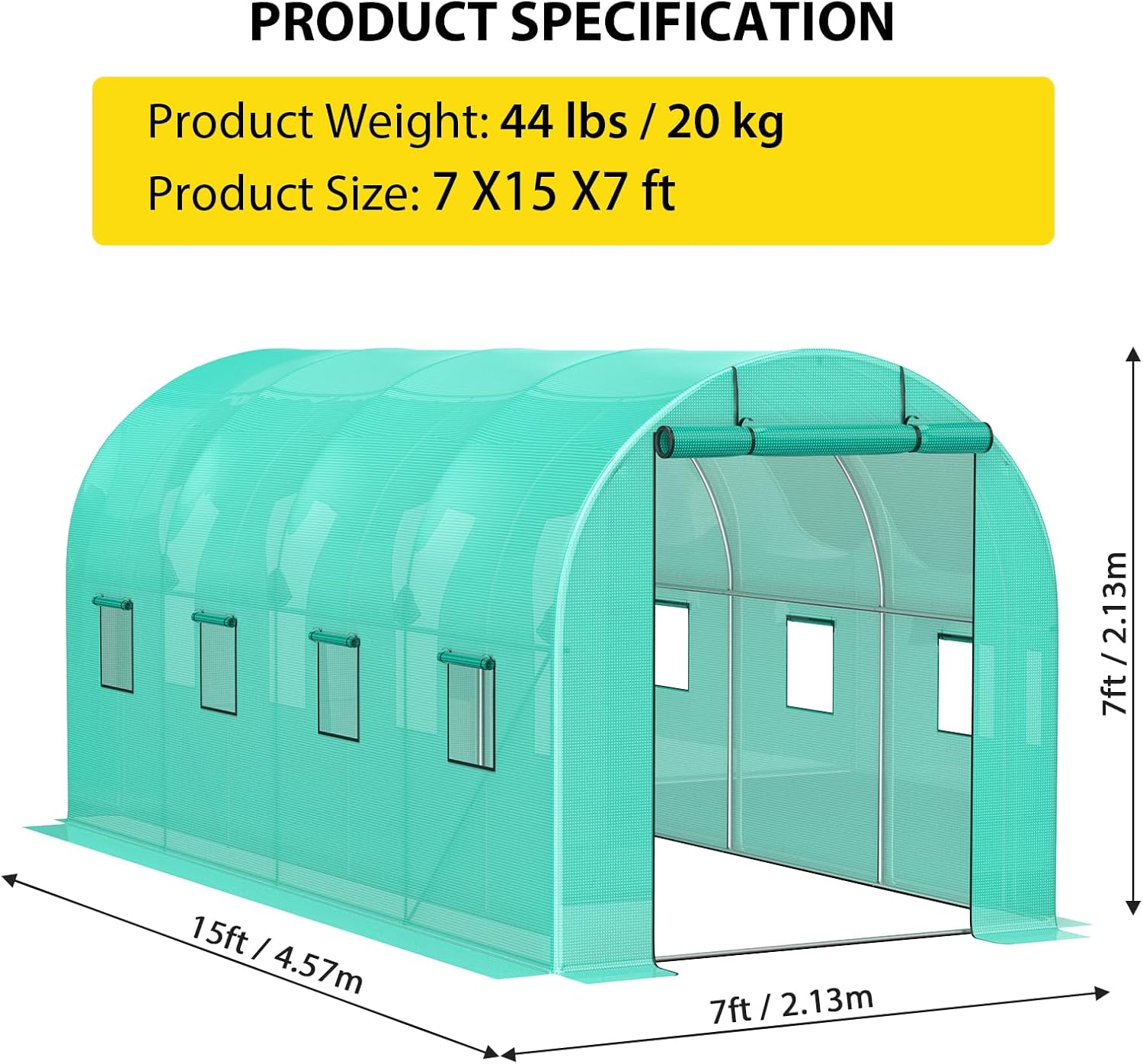 Compact Greenhouse Kit 7'x15'x7' with Galvanized Frame, 140G Green PE Cover, 1 Door & 8 Windows for Outdoor Gardening