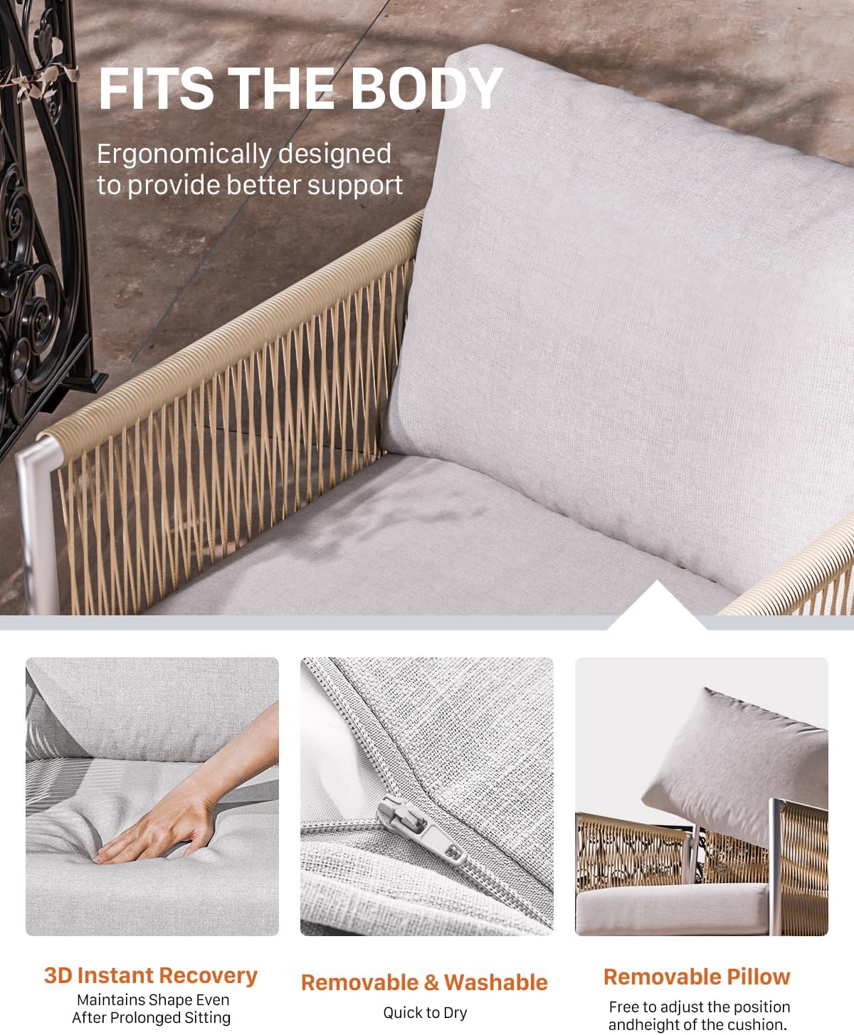 - ⛱️【6" Removable & Machine-washable Seat Cushion】 This outdoor furniture's cushion covers are removable and machine-washable, making cleaning effortless and keeping your set looking like new. Seat cushion of the set comes with high-density sponge, better for upper-body support, cushions are designed to be stable, keeping them from sliding around.