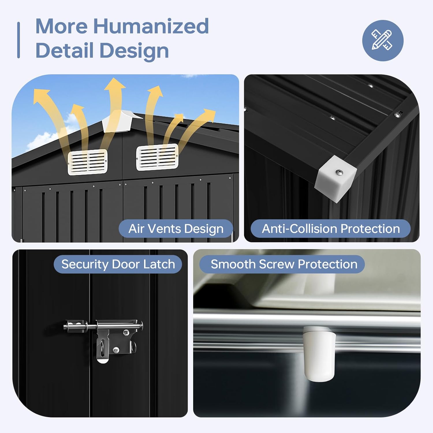 - Robust & Weatherproof Build: This outdoor storage shed is constructed from galvanized steel with waterproof engineering. It delivers enduring resilience against severe weather. Its reinforced metal roof and walls prevent deformation, while the sturdy frame withstands winds up to 30mph (Level 6) and snow loads of 6 inches.