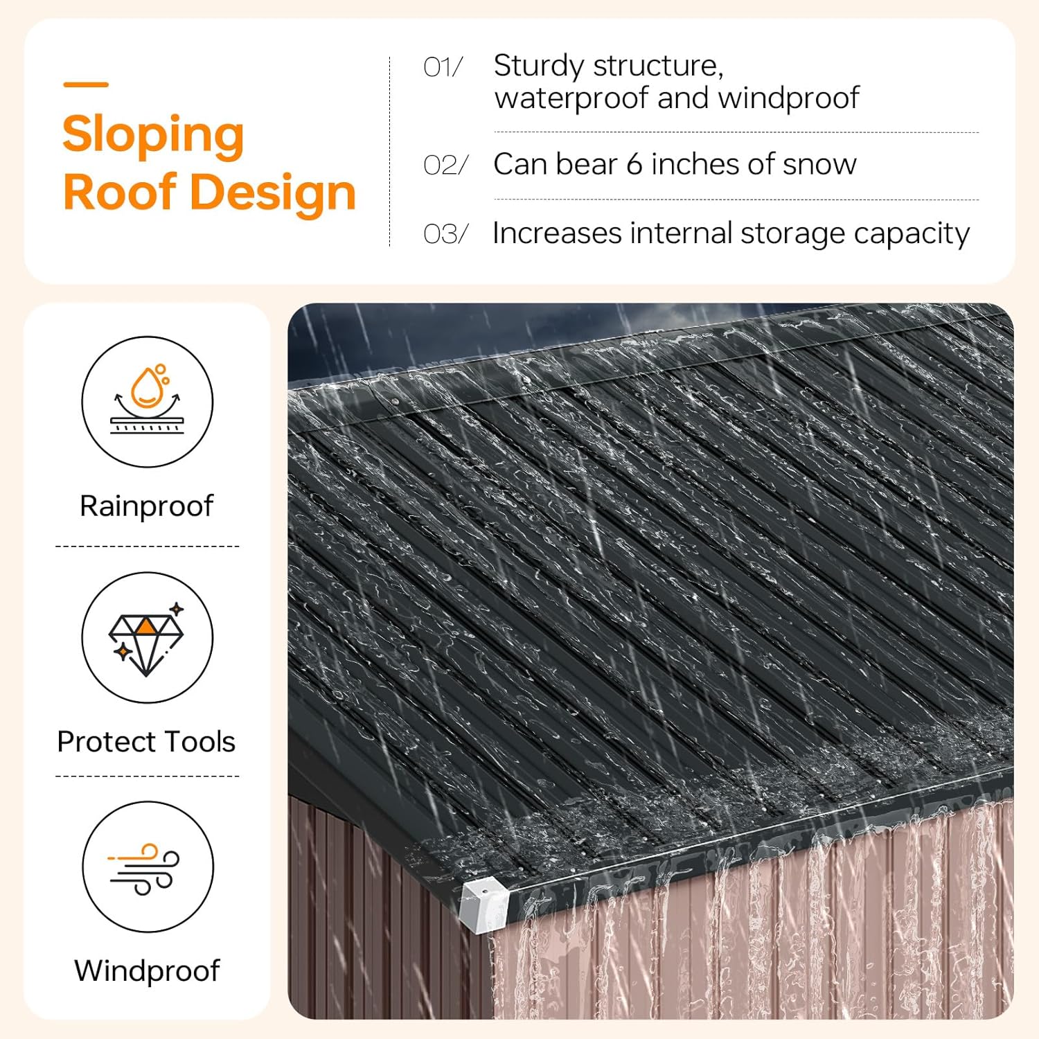 - Robust & Weatherproof Build: This outdoor storage shed is constructed from galvanized steel with waterproof engineering. It delivers enduring resilience against severe weather. Its reinforced metal roof and walls prevent deformation, while the sturdy frame withstands winds up to 30mph (Level 6) and snow loads of 6 inches.
