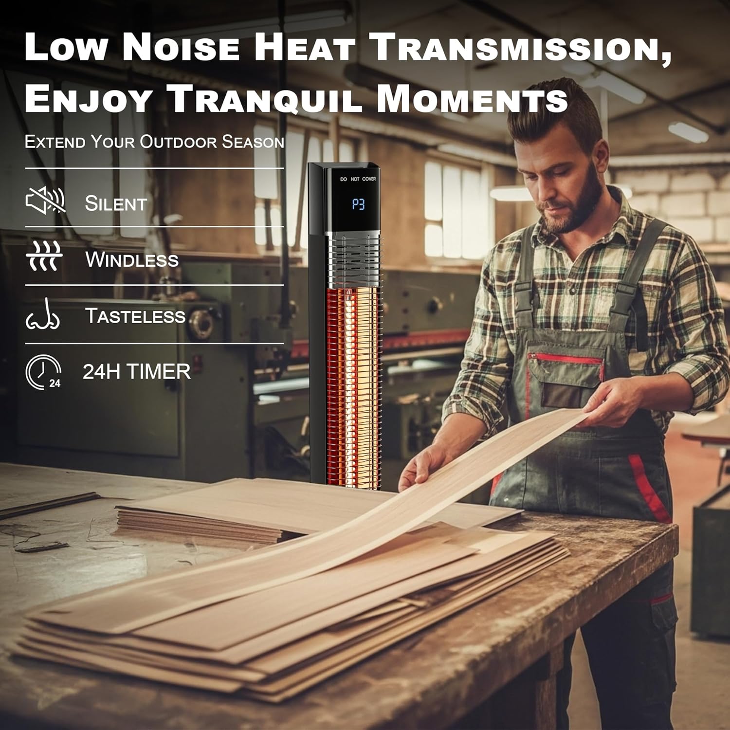 - 24H TIMER: To avoid potential safety hazards and save energy, you can set a time from 1-24 hours with the outdoor electric heater. The infrared heater is great for noise-sensitive environments because it doesn't use a fan- it just heats light